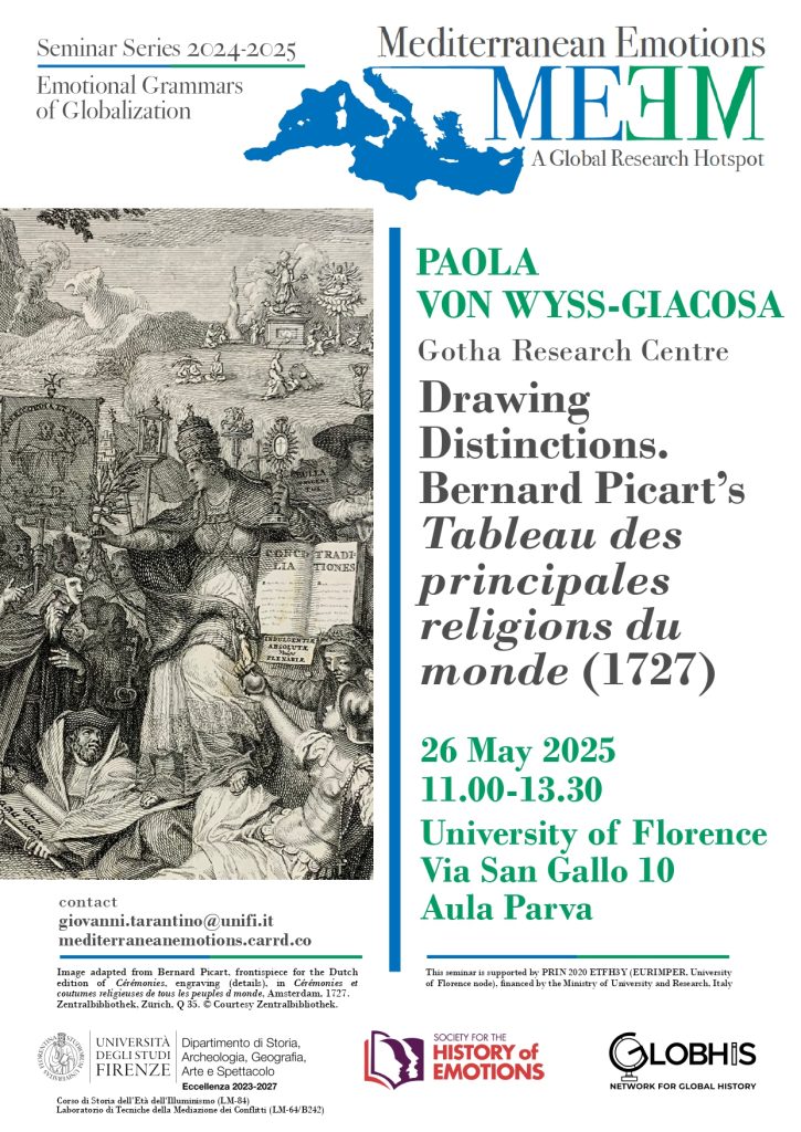 The second seminar of this series will be delivered by Dr Paola von Wyss-Giacosa (Gotha Research Centre, University of Switzerland) who will present a paper on ‘Drawing Distinctions. Bernard Picart’s Tableau des principales religions du monde (1727)’. This seminar will take place on the 26th May 2025 at The University of Florence, Via San Gallo 10, Aula Sapienza. For details on how to attend please see the poster below or visit the Mediterranean Emotions Website.