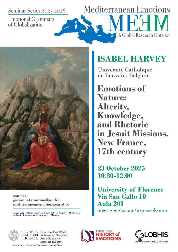 The second seminar of this series will be delivered by Dr Isabel Harvey (Universite Catholique de Louvain) who will present a paper on ‘Emotions of Nature: Alterity, Knowledge, and Rhetoric in Jesuit Missions. New France, 17th Century’. This seminar will take place on the 23rd October 2025 at The University of Florence, Via San Gallo 10, Aula Sapienza. For details on how to attend please see the poster below or visit the Mediterranean Emotions Website.